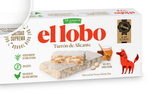 Ingredientes: Almendras tostadas (60%), jarabe de glucosa y fructosa , miel 100% origen España (13%), azúcar moreno de caña integral, clara de huevo de gallinas camperas. Oblea de recubrimiento (fécula de patata, aceite refinado de girasol). Puede contener trazas de otros frutos de cascara y cacahuete.